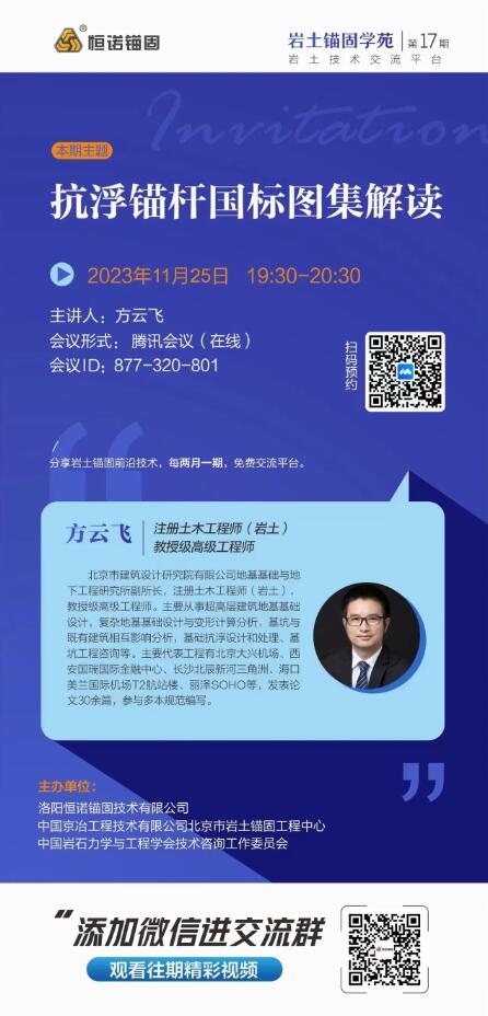 巖土錨固學苑將于2023年11月25日(周六)19:30-20:30舉辦第17期,本期主題:抗浮錨桿國標圖集解讀,歡迎廣大巖土錨固領域愛好者參與交流。