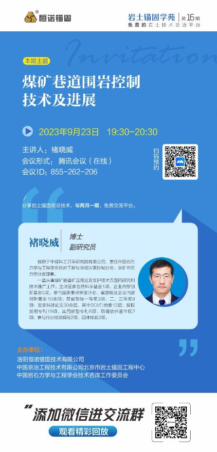 巖土錨固學(xué)苑將于2023年9月23日(周六)19:30-20:30舉辦第16期,本期主題:煤礦巷道圍巖控制技術(shù)及進(jìn)展,歡迎廣大巖土錨固領(lǐng)域愛(ài)好者參與交流。