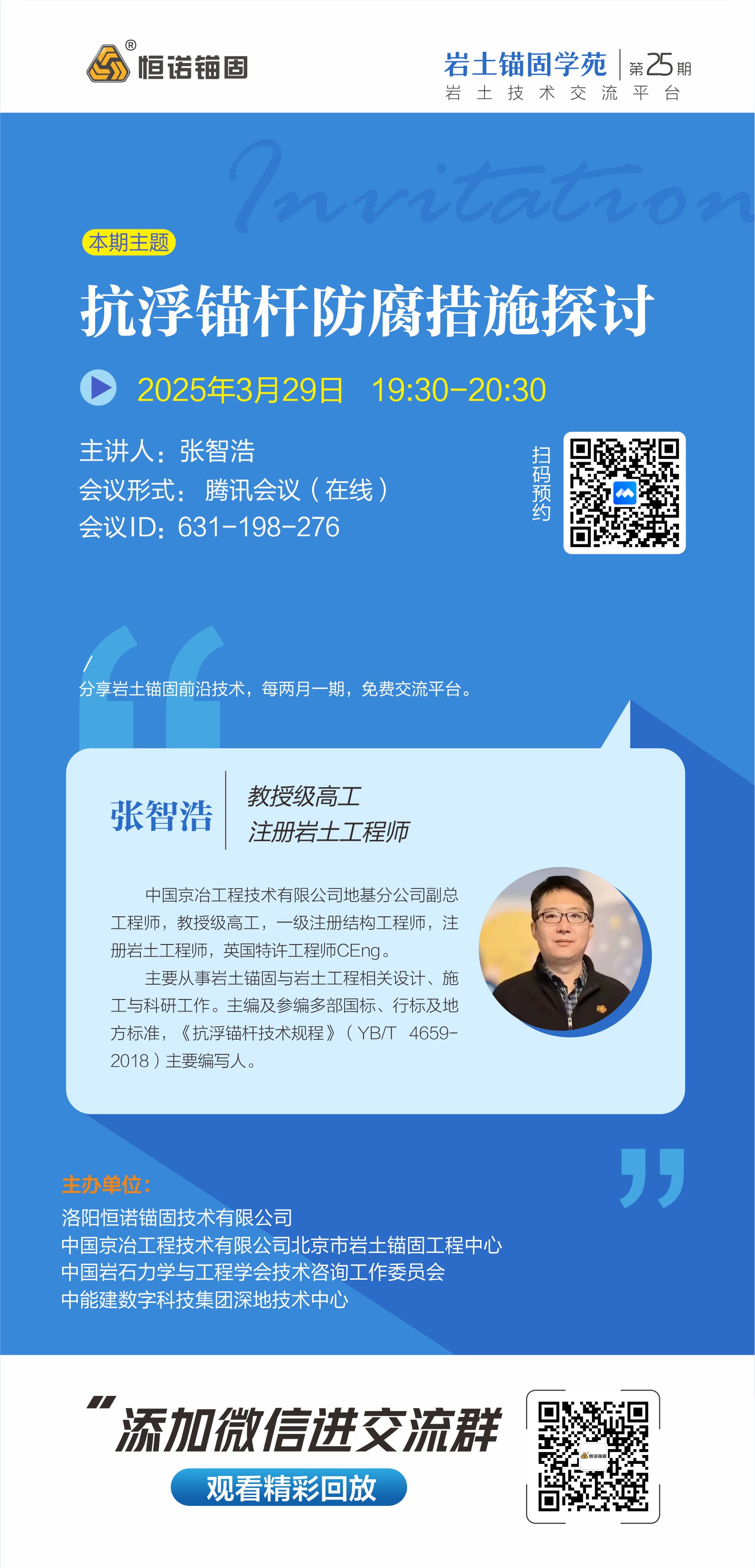 巖土錨固學苑是由洛陽恒諾錨固技術有限公司、中國京冶工程技術有限公司北京市巖土錨固工程中心、中國巖石力學與工程學會技術咨詢工作委員會和中能建數字科技集團深地技術中心聯合舉辦的線上交流研討會,兩月一期邀請行業內不同專家學者線上分享巖土錨固的技術、工藝、產品、應用等,旨在為廣大巖土領域人士提供免費的學習平臺,增進巖土錨固專家、學者、從業人員之間的互動交流。