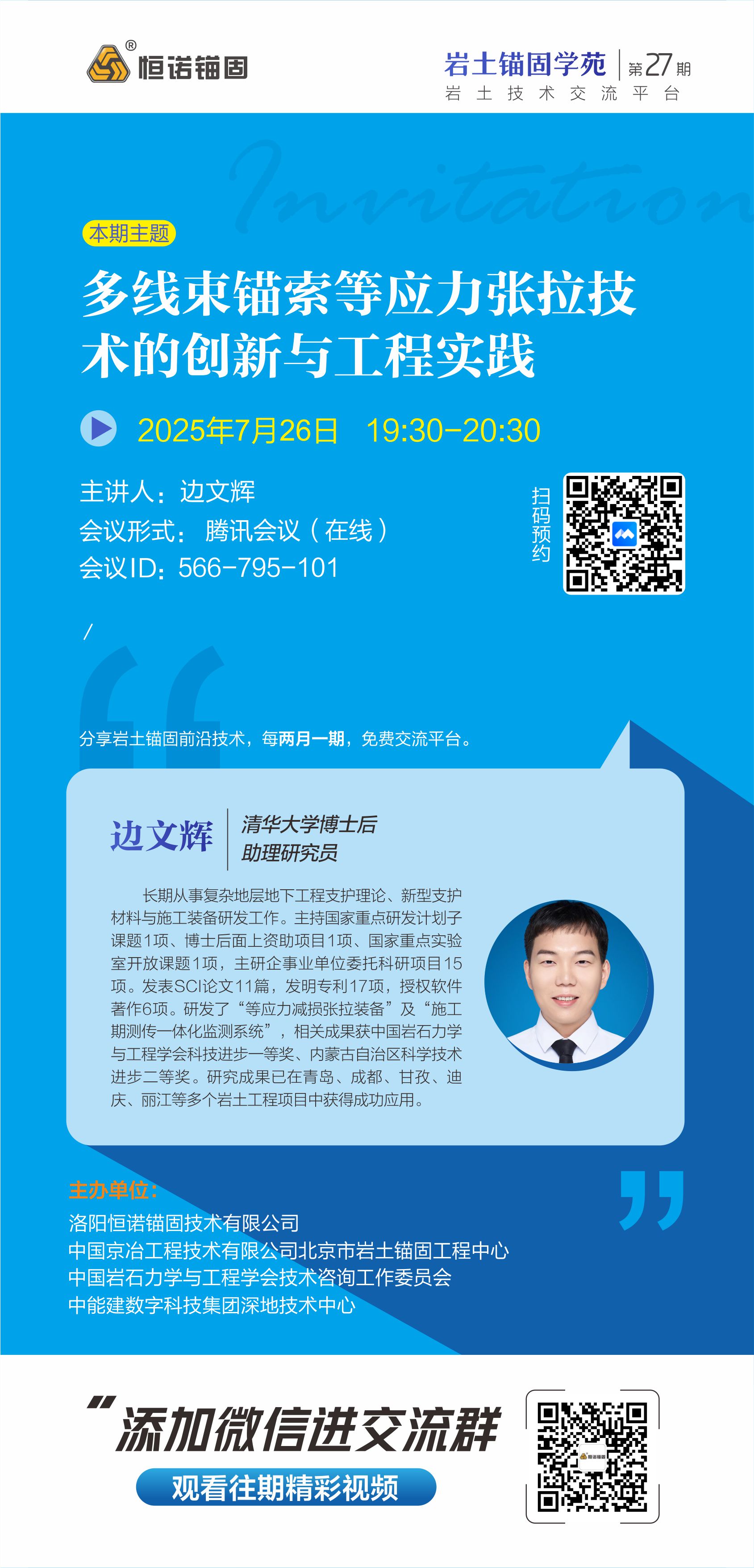巖土錨固學苑是由洛陽恒諾錨固技術有限公司、中國京冶工程技術有限公司北京市巖土錨固工程中心、中國巖石力學與工程學會技術咨詢工作委員會和中能建數字科技集團深地技術中心聯合舉辦的線上交流研討會,兩月一期邀請行業內不同專家學者線上分享巖土錨固的技術、工藝、產品、應用等,旨在為廣大巖土領域人士提供免費的學習平臺,增進巖土錨固專家、學者、從業人員之間的互動交流。